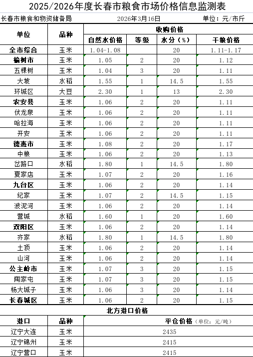 全市粮食收购进度及价格信息(2026年3月17日)